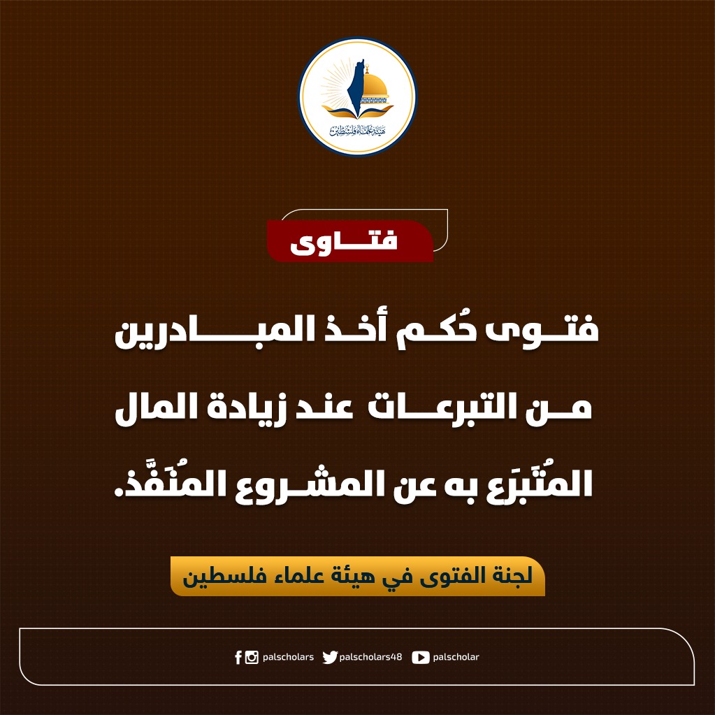 6/1/2026 لجنة الفتوى في هيئة علماء فلسطين السؤال: تأتينا أموال من متبرعين لتنفيذ مشاريع إغاثية، ونزودهم بتقرير تفصيلي عن تكلفة المشروع قبل تنفيذه، فسؤالي هو: لو أخبرت الأخ المتبرع بأن سعر السلعة في التقرير المرسل له ب50 شيكل، واستطعت أن أشتريها بعد ذلك من...