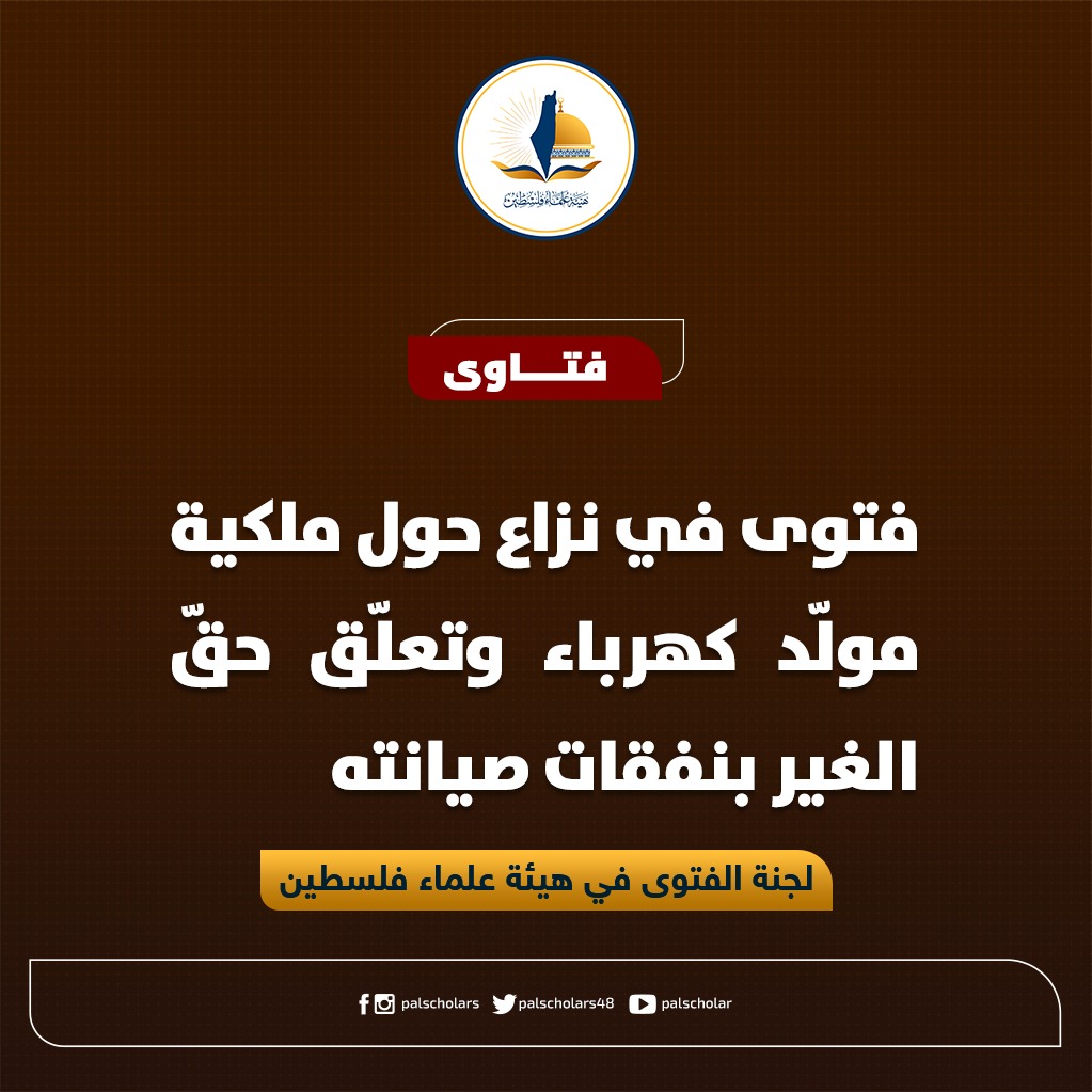 7/1/2026 لجنة الفتوى في هيئة علماء فلسطين السؤال: يوجد لدينا في غزة نزاع على ملكية مولد كهرباء قدرة ١٢ كيلو وات. حيث قام العدو باجتياح المكان وتهجير سكانه، وهنالك مواطن كان يملك المولد المذكور ترك بيته وعائلته نجاةً بأنفسهم ، كان من المحتمل وبشكل كبير...