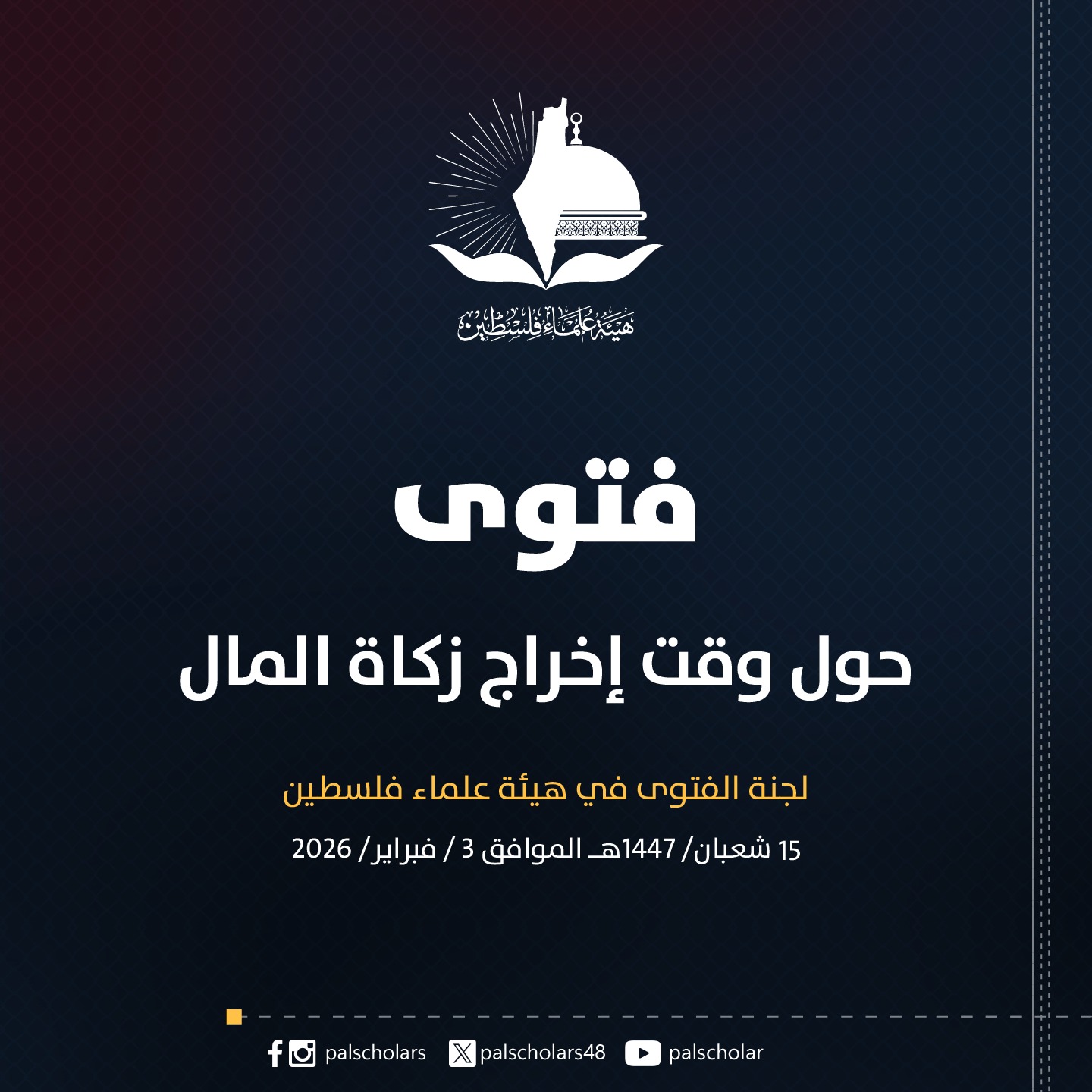 5/2/2026 المفتي: لجنة الفتوى في هيئة علماء فلسطين السؤال: السلام عليكم ورحمة الله وبركاته الإخوة في لجنة الفتوى في هيئة علماء فلسطين حفظكم الله نتوجه إليكم بالتحية سائلين المولى عزّ وجلّ ان يبارك جهودكم وينفع بكم الإسلام واهله. تمس الحاجة عندنا في لبنان عموما، ومخيمات اللاجئين الفلسطينيين...