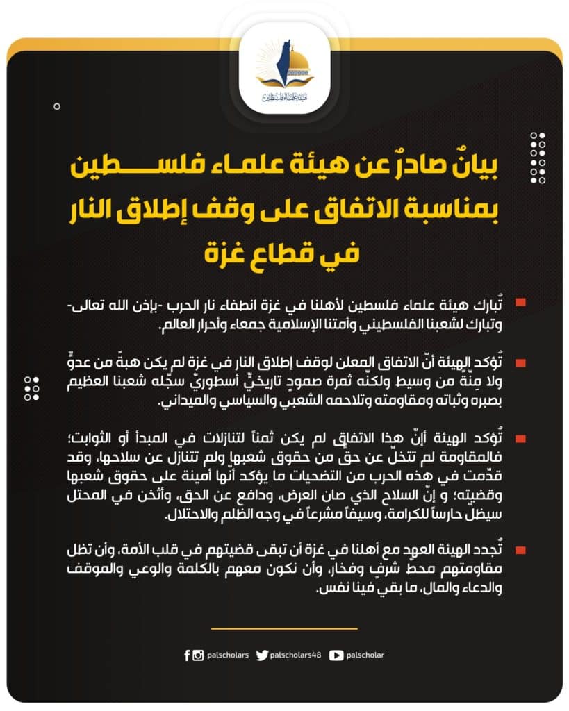 وإنّ هيئة علماء فلسطين وهي تبارك لأهلنا في غزة انطفاء نار الحرب بإذن الله تعالى وتبارك لشعبنا الفلسطيني وأمتنا الإسلامية جمعاء وأحرار العالم؛ فإنّها تؤكّد الآتي: