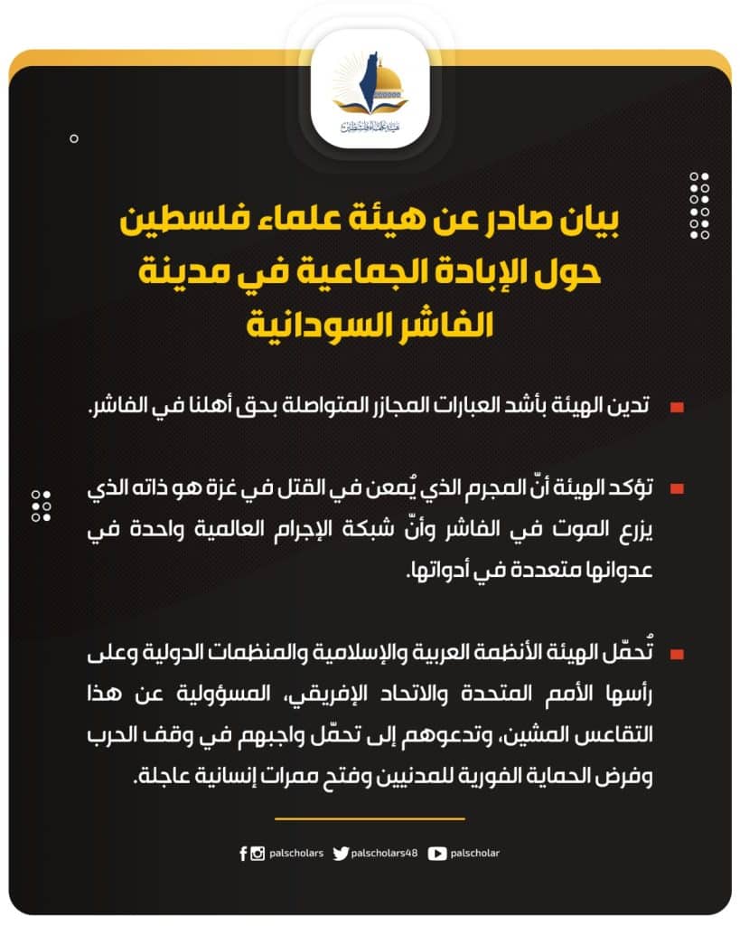 فإن هيئة علماء فلسطين تتابع بقلوب يعتصرها الألم وضمائر يغمرها الحزن ما يجري من إبادة جماعية في مدينة الفاشر بإقليم دارفور في السودان حيث تتعرض المدينة لمجازر وقتل وتهجير وتدمير منظم يُنذر بكارثة إنسانية كبرى، في ظل صمت دوليّ مطبق وتجاهل عربيّ وإسلامي يندى له جبين الأمة.
