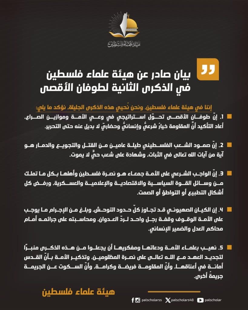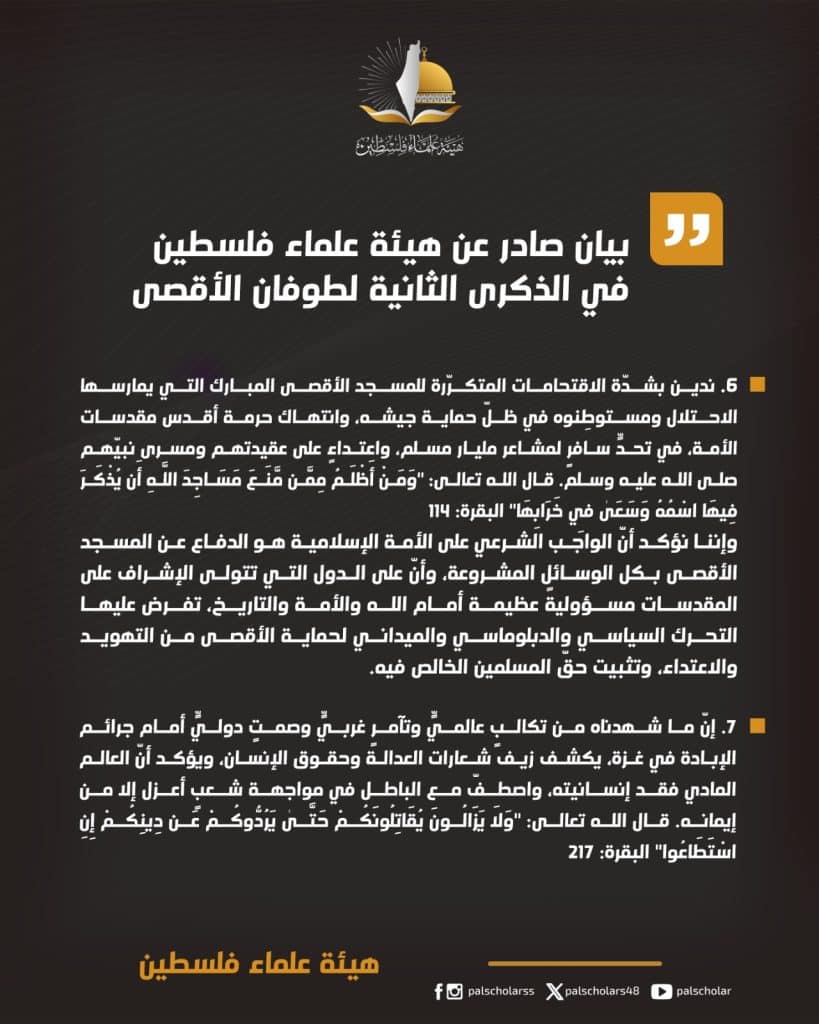 خامسًا: نهيب بعلماء الأمة ودعاتها ومفكريها أن يجعلوا من هذه الذكرى منبرًا لتجديد العهد مع الله تعالى على نصرة المظلومين، وتذكير الأمة بأنّ القدس أمانة في أعناقها، وأنّ المقاومة فريضة وكرامة، وأنّ السكوت عن الجريمة جريمةٌ أخرى.