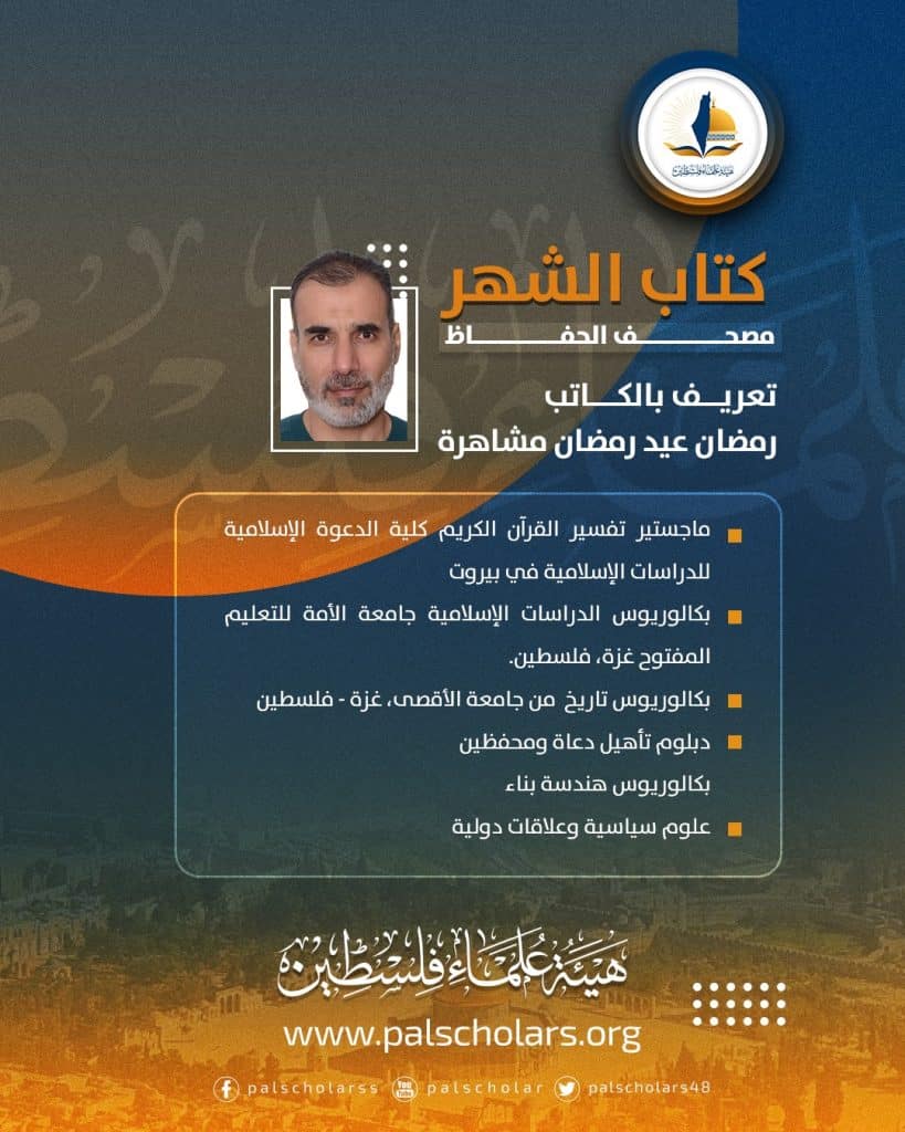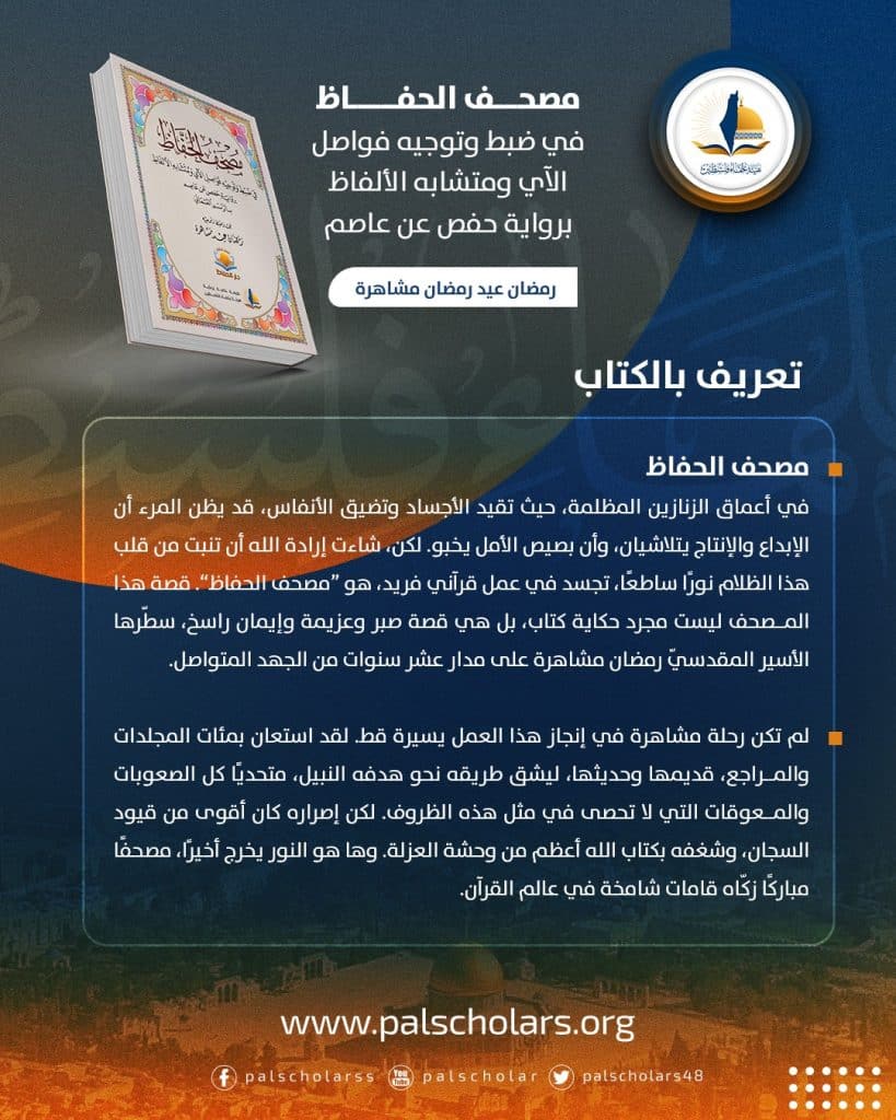 تزف هيئة علماء فلسطين إلى الأمّة الإسلامية بشرى طباعة (2200 نسخة) من مصحف الحفّاظ بفضل الله عزّ وجل، في خطوة مباركة ضمن مشروعها لنشر كتاب الله وتيسير حفظه وتدبّره، ويأتي هذا العمل المبارك في سياق خدمة القرآن الكريم، والدعوة إلى الله تعالى، والمشاركة في أعظم ميادين الخيرية، مصداقًا لقوله جلّ وعلا: ﴿ومن أحسنُ قولاً ممن دعا إلى اللهِ وعمل صالحاً وقال إنني من المسلمين﴾، وقول النبي ﷺ: “خيرُكم من تعلَّم القرآن وعلَّمه”.