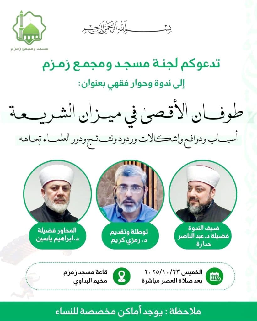 شارك رئيس قسم الفروع في الهيئة د. رمزي كريّم في ندوة وحوار فقهي نظّمتها لجنة مسجد ومجمع زمزم بعنوان: “ طوفان الاقصى في ميزان الشريعة ” يوم الخميس 23/ 10 / 2025 في مخيم البداوي، شمالي لبنان .