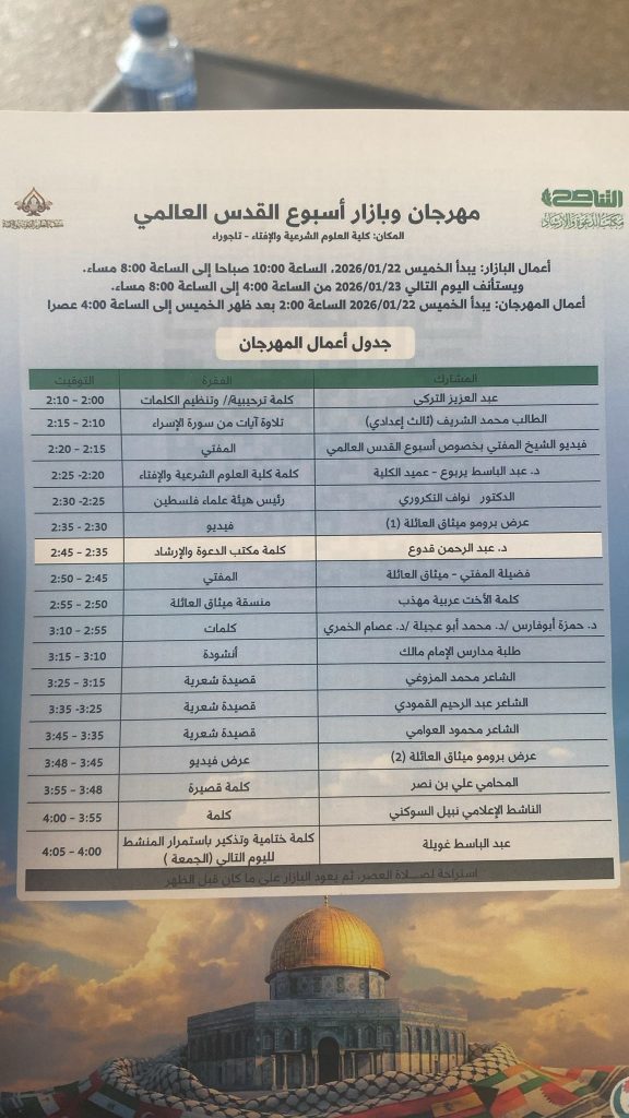 ضمن فعاليات اسبوع القدس العالمي السادس بمناسبة الإسراء والمعراج تحت شعار:{ القدس وغزة وعد قريب ) أقامت جزر القمر ندوة علمية كبرى بعنوان (القدس وغزة في قلوب القمريين) وذلك يوم17/01/2026 في مقر الرابطة الخيرية الإسلامية في جنوب العاصمة مروني.