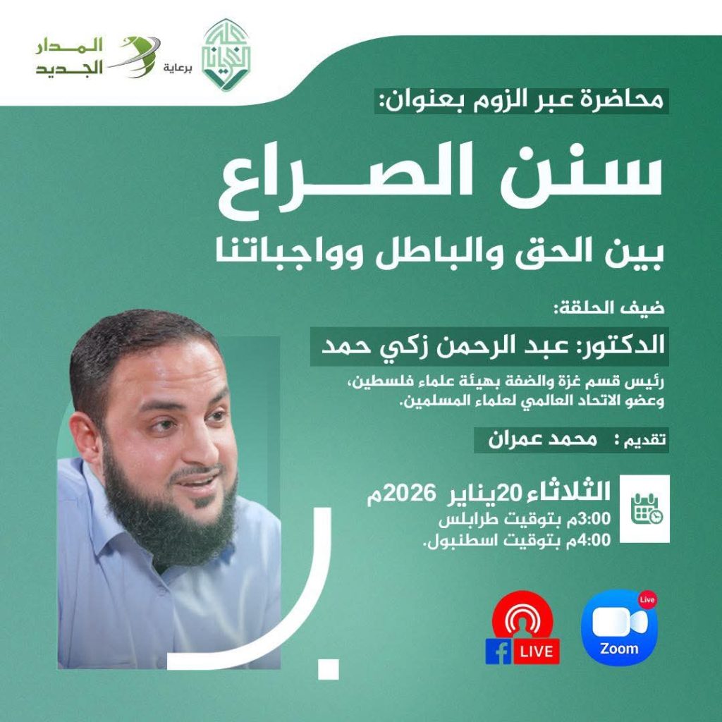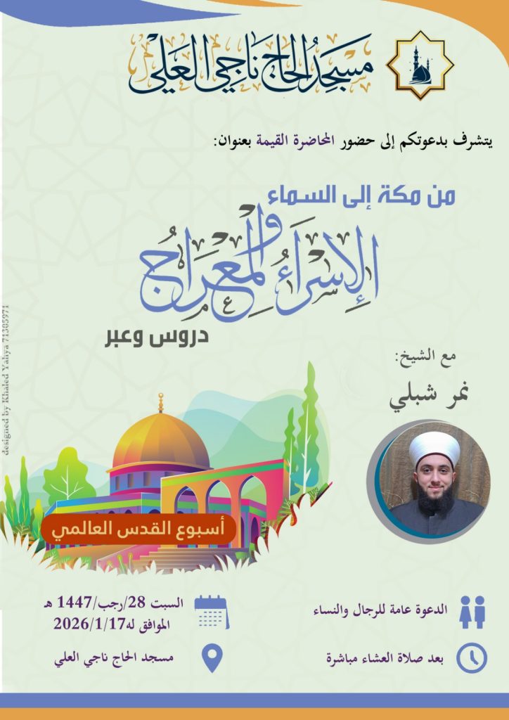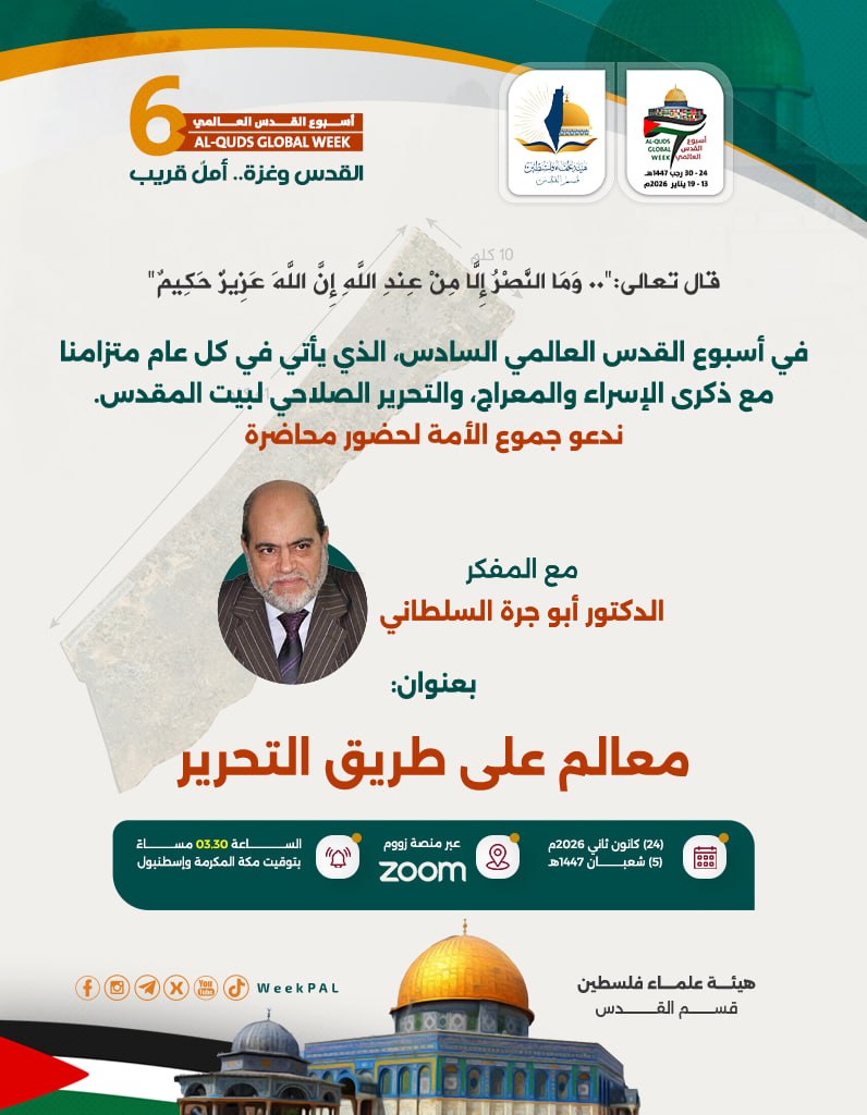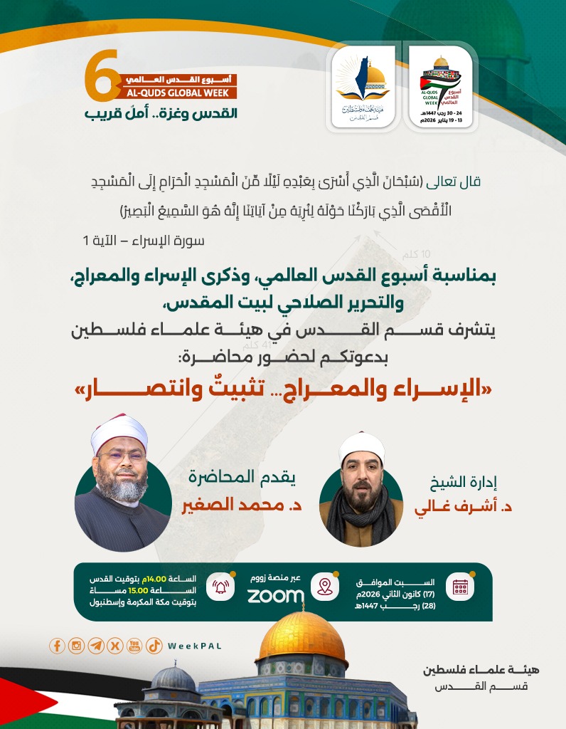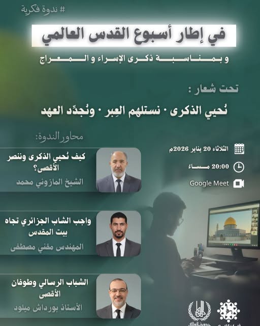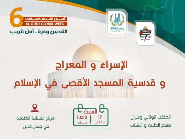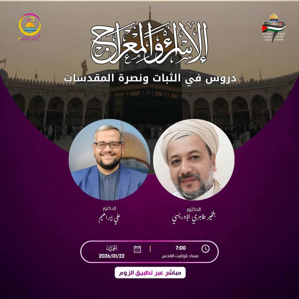 في إطار أسبوع القدس العالمي وبمناسبة ذكرى الإسراء والمعراج، ندعوكم لحضور ندوة فكرية تحمل شعار: (نُحيي الذكرى · نستلهم العِبر · ونُجدّد العهد)