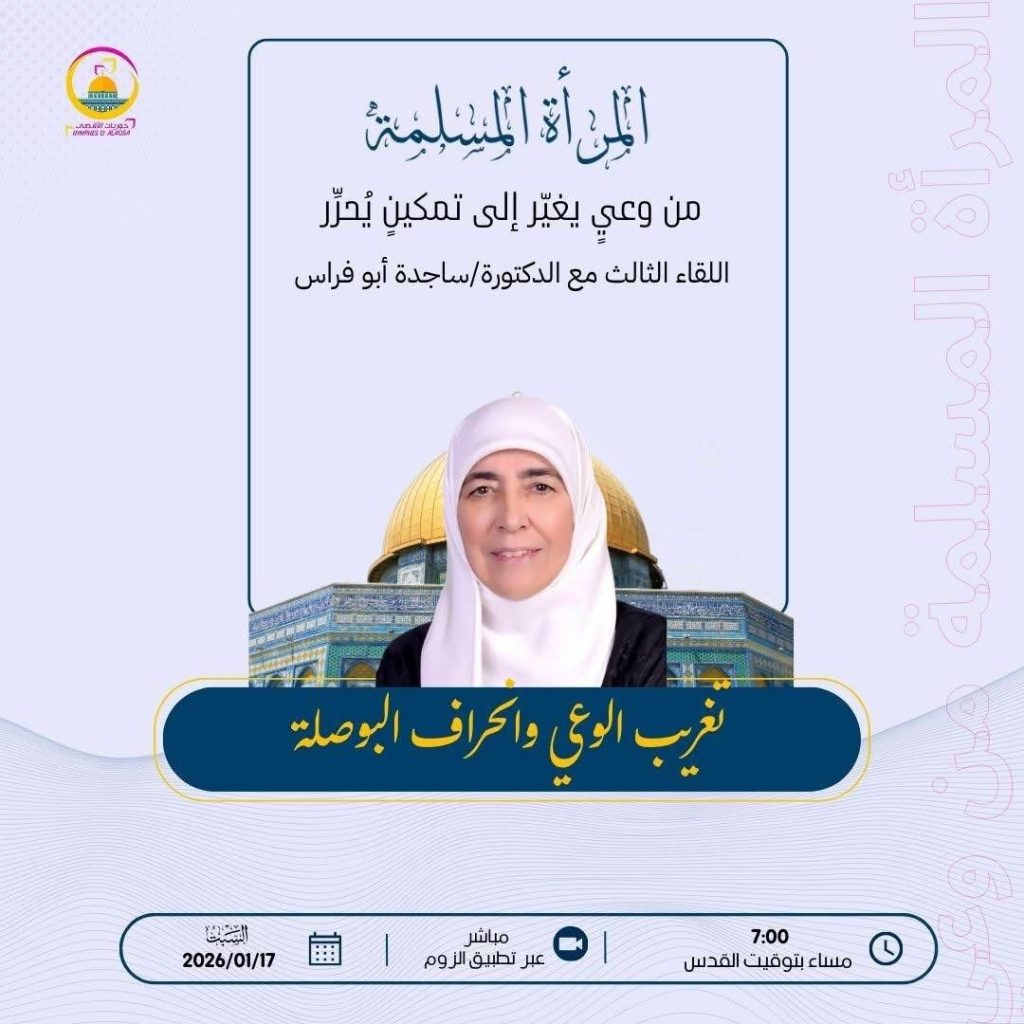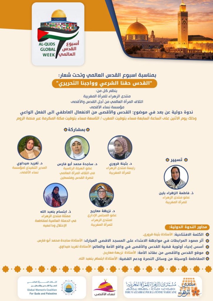 بمناسبة أسبوع القدس العالمي يتشرف منتدى الزهراء للمرأة المغربية أقامت ندوة عالمية بعنوان {القدس و الأقصى: من الانفعال العاطفي ، إلى الفعل الواعي} و التي انعقدت يوم الإثنين 30 رجب 1447 ه الموافق 19 يناير 2026