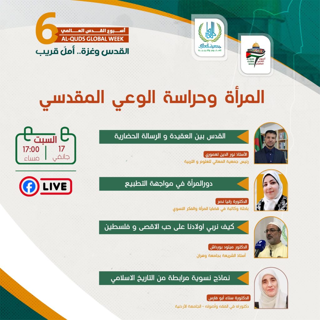 ضمن فعاليات أسبوع القدس العالمي (6) وتحت شعار: القدس وغزة… أمل قريب تُنظَّم هذه الندوة الفكرية التوعوية بعنوان: ✨ المرأة وحراسة الوعي المقدسي ✨