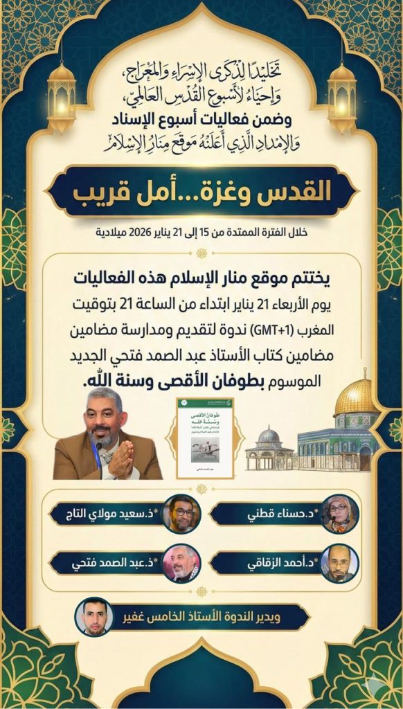 تخليدا لذكرى الإسراء والمعراج، وإحياء لأسبوع القدس العالمي، وضمن فعاليات أسبوع الإسناد والإمداد الذي أعلنه موقع منار الإسلام تحت شعار: *القدس وغزة…أمل قريب* خلال الفترة الممتدة من 15 إلى 21 يناير 2026 ميلادية، يختتم موقع منار الإسلام هذه الفعاليات يوم الأربعاء 21 يناير ابتداء من الساعة 21 بتوقيت المغرب (GMT+1) ندوة لتقديم ومدارسة مضامين كتاب الأستاذ عبد الصمد فتحي الجديد الموسوم *بطوفان الأقصى وسنة الله*.